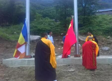 7月12日(農歷六月十九),大九華山平坦寺舉行了該寺重建以來首次“國旗進寺廟”活動。圖為今日清晨,平坦寺住持釋廣濟帶領眾徒弟及居士作升旗前的準備工作。
