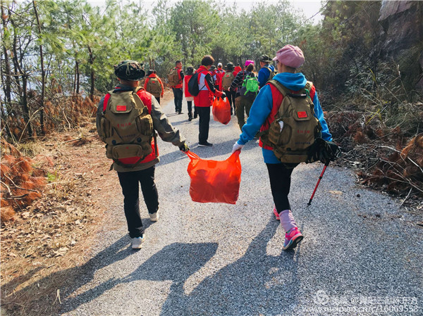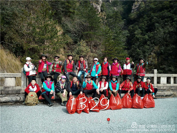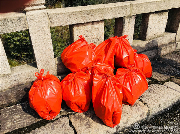 “文明青陽我先行,戶外清理白色垃圾”活動至今已開展25期,累計服務(wù)時長超過200小時,活動會不定期開展,自志愿者們徒步走上各大景點(diǎn),清理了青陽境內(nèi)各旅游景點(diǎn)、戶外登山線路上的白色垃圾,克服種種困難把清理的白色垃圾裝袋肩扛手提運(yùn)到山下垃圾池?;顒庸睬謇砹税咨?00余袋,大大的改善了各戶外登山線路的環(huán)境衛(wèi)生,使青陽的山水更加秀麗,同時“青陽三獻(xiàn)”紅馬甲也成了靈秀青陽一道靚麗的風(fēng)景。
