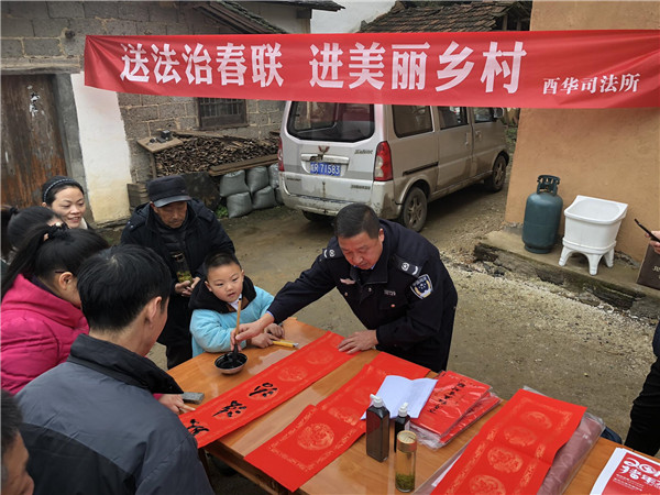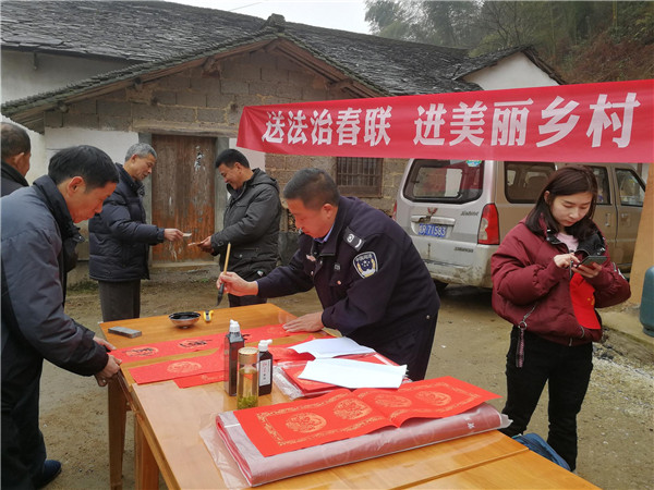 在2019年新春佳節(jié)即將來臨之際,酉華司法所施世慶于1月29日上午,跟隨酉華鎮(zhèn)黨委政府組織的“2019 年‘接您回家’暨新春‘四送’暖心活動(dòng)”走進(jìn)革命老區(qū)·美麗鄉(xiāng)村——宋沖,開展“送法治春聯(lián)·進(jìn)美麗鄉(xiāng)村”活動(dòng)。為廣大返鄉(xiāng)農(nóng)民朋友送上了新春佳節(jié)法治文化“年貨”。在宋沖村陽(yáng)光服務(wù)站活動(dòng)現(xiàn)場(chǎng),鎮(zhèn)綜治辦、司法所調(diào)委會(huì)主任施世慶飽含熱情,擺開書案,攤開宣紙,揮毫潑墨,將真誠(chéng)的祝福與法治宣傳相結(jié)合,賦諸筆端。群眾紛紛趕來現(xiàn)場(chǎng)排隊(duì)領(lǐng)取,互相談?wù)撝鞲贝郝?lián)的寓意,有的根據(jù)新年心愿從準(zhǔn)備好的春聯(lián)中精心挑選,有的期望施世慶為其精心定制現(xiàn)場(chǎng)創(chuàng)作。“法治成風(fēng)國(guó)泰,道德化雨民安”等,這些對(duì)聯(lián)蘊(yùn)含著樸素的法治元素和文化理念,深受群眾喜愛。自活動(dòng)開展以來,共為創(chuàng)業(yè)返鄉(xiāng)農(nóng)民朋友書寫法治春聯(lián)1000余幅,將法治文化融于春聯(lián)當(dāng)中,貼近了群眾的生活,營(yíng)造出一種“抬頭就見法,進(jìn)門先學(xué)法,過節(jié)不忘法”的良好氛圍,收到了良好的社會(huì)效果。