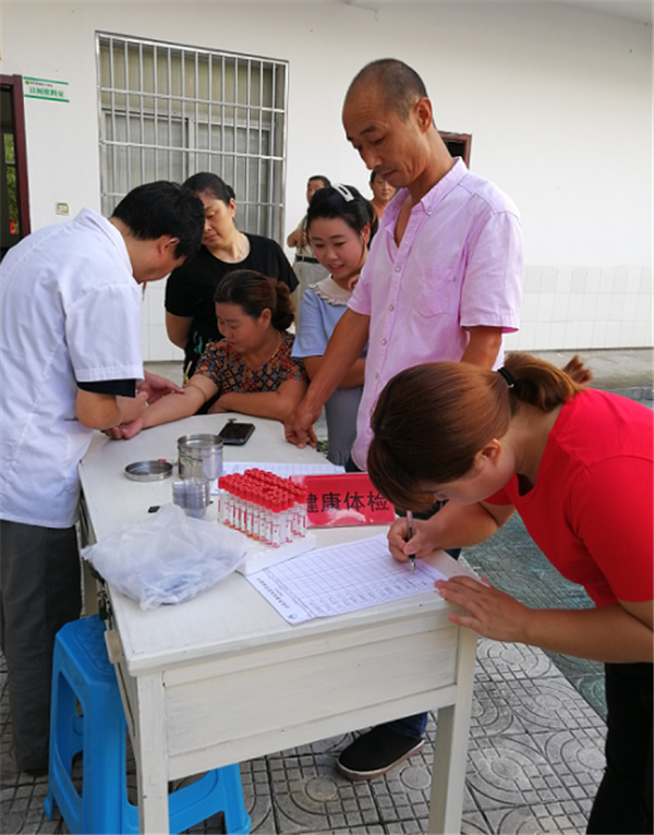 講座結(jié)束后,在志愿者的協(xié)助下,王長(zhǎng)春和將軍村村醫(yī)為健康家庭成員進(jìn)行體檢,包括抽血、心電圖、尿檢等項(xiàng)目。