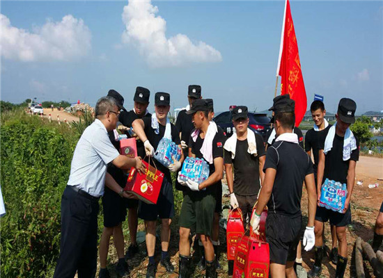 7月8日,烈日炎炎,為防止抗洪一線的干部群眾因高溫出現(xiàn)中暑、脫水等癥狀。五溪山色大酒店總經(jīng)理張春紅一行向奮戰(zhàn)在一線的公安戰(zhàn)警、特警及支援童埠圩的某部隊(duì)官兵送去人丹100盒、十滴水100瓶、風(fēng)油精100瓶、飲料10件、礦泉水30件、水果20箱、殺蟲劑24瓶。
