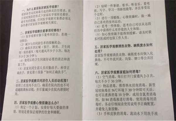 “這個(gè)手冊很實(shí)用啊!手冊上寫了很多居家醫(yī)學(xué)觀察時(shí)需要注意到的一些事項(xiàng)。比如居家醫(yī)學(xué)觀察期間需要注意什么,居家醫(yī)學(xué)觀察共同居住人員的活動(dòng)范圍有多大,居家觀察人員垃圾如何處理等等。最讓我感到暖心的是這個(gè)手冊上還寫上了我們居家醫(yī)學(xué)觀察人員心情煩躁時(shí)可通過“五大舒緩法”(制定一個(gè)計(jì)劃、專研一件事情、進(jìn)行一項(xiàng)鍛煉、思考一些體驗(yàn)、電話一通傾訴)來舒展心情,我一拿到這本手冊,我就試了一下,還真的挺管用?!鼻嚓柨h木鎮(zhèn)鎮(zhèn)武圣村居家醫(yī)學(xué)觀察者曹雙雙說道。