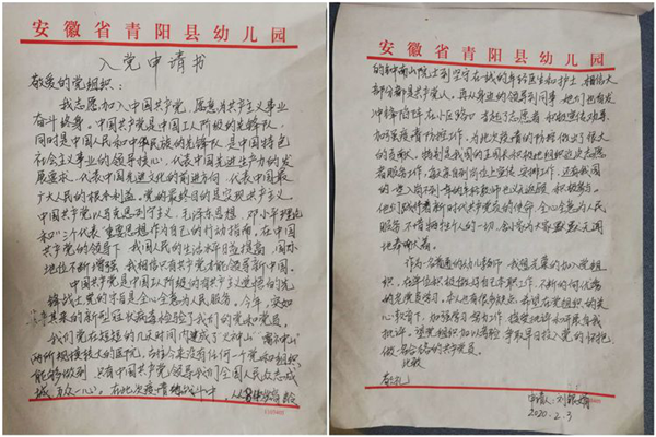 “敬愛的黨組織,我志愿加入中國共產(chǎn)黨……”在黨員群眾齊心協(xié)力抗擊疫情的關(guān)鍵時刻,2月1日,青陽縣幼兒園普通教師劉銀娟第一時間報名加入抗擊疫情志愿服務(wù)行列,并連夜向黨組織遞交了入黨申請書,向一線請戰(zhàn)。劉老師說:“我是一個中國人,有責(zé)任和義務(wù)為抗擊疫情盡一份力。”