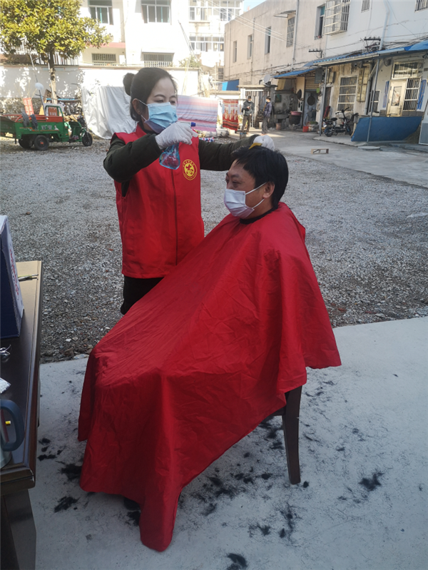 該集團(tuán)志愿者王洪聽到同事正在為理發(fā)煩惱時(shí),便把此事放在心上,回家和從事理發(fā)行業(yè)的愛人商量著:“我們抽個(gè)時(shí)間給大家理個(gè)發(fā)吧”,兩人會(huì)意一笑,隨即準(zhǔn)備著工具,來到了城市經(jīng)營公司大院內(nèi),測量體溫、戴上口罩,一把剪刀,一把梳子,一張圍布,便支起了簡單的“場子”,伴隨著咔嚓的聲音,紅色志愿服顯得格外的耀眼。
