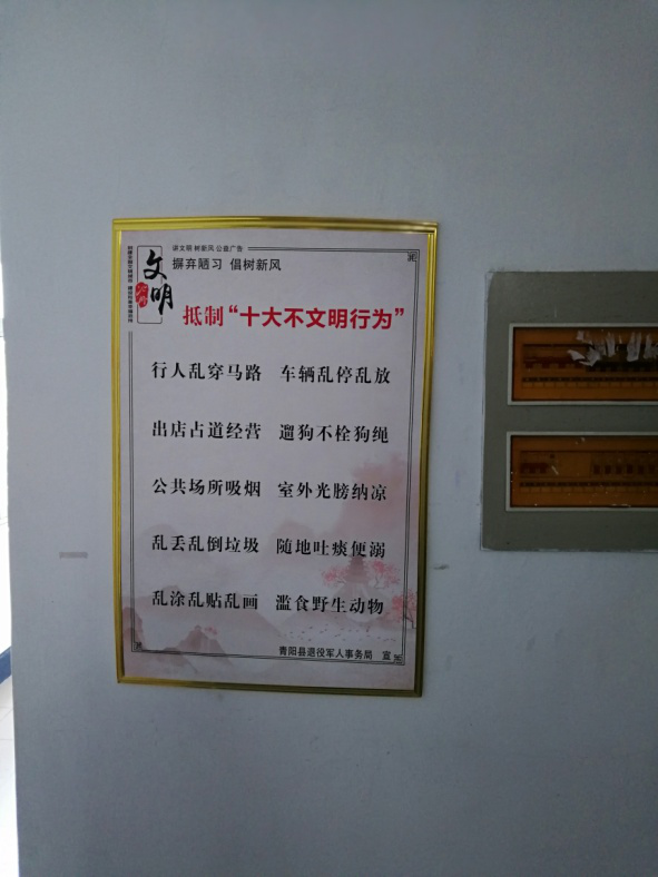 為有效遏制不文明行為,培樹(shù)人民群眾養(yǎng)成良好生活習(xí)慣,4月15日縣退役軍人事務(wù)局在機(jī)關(guān)辦公樓走廊文化墻范圍內(nèi)張貼展示“抵制‘十大不文明行為’”行動(dòng),向不文明行為說(shuō)“不”宣傳活動(dòng)。