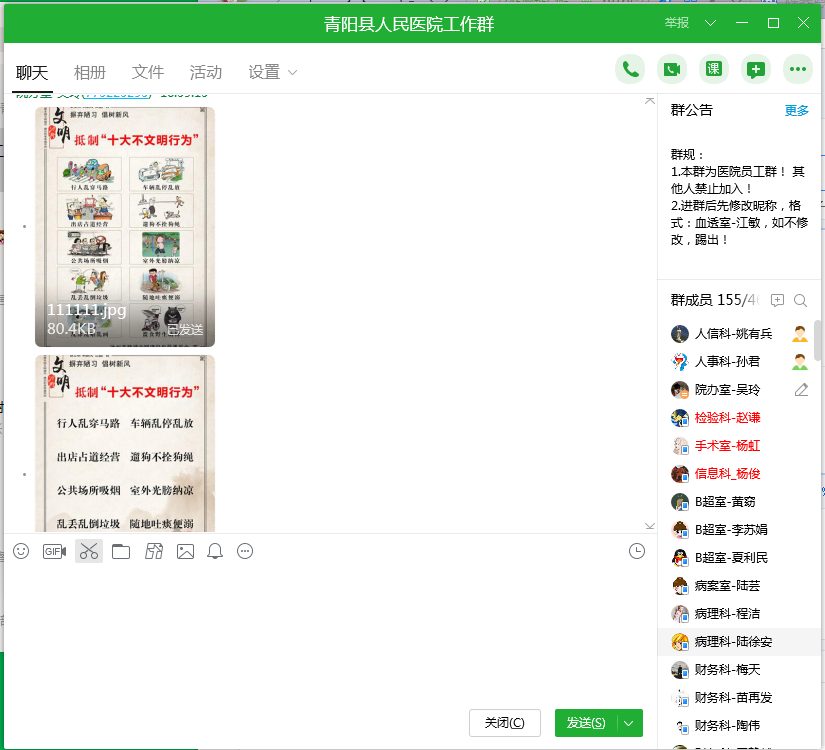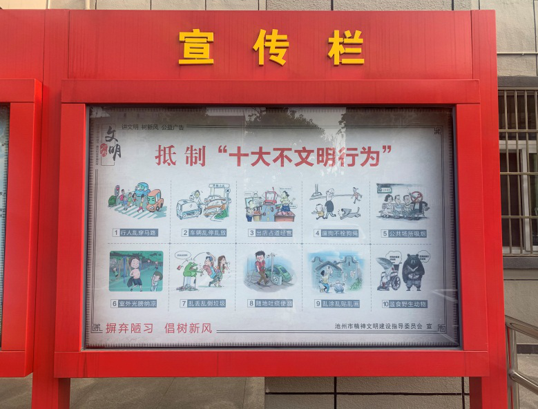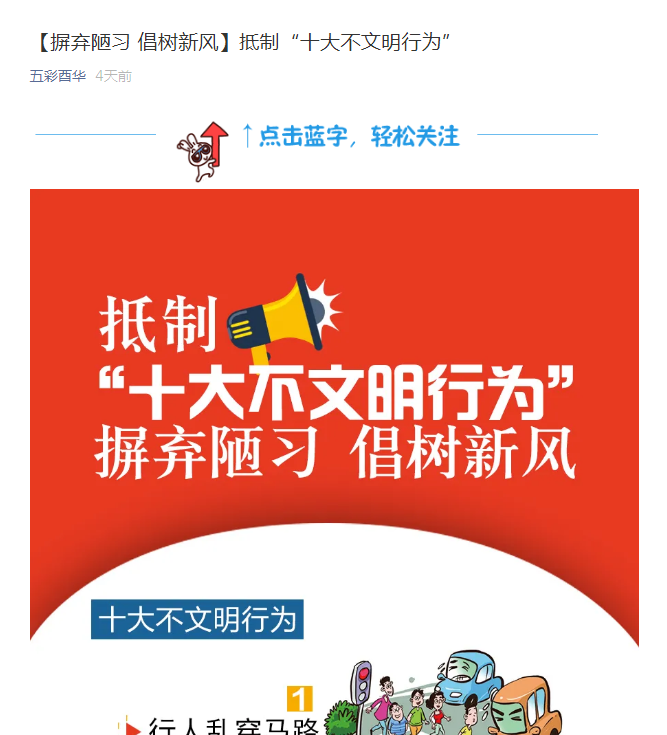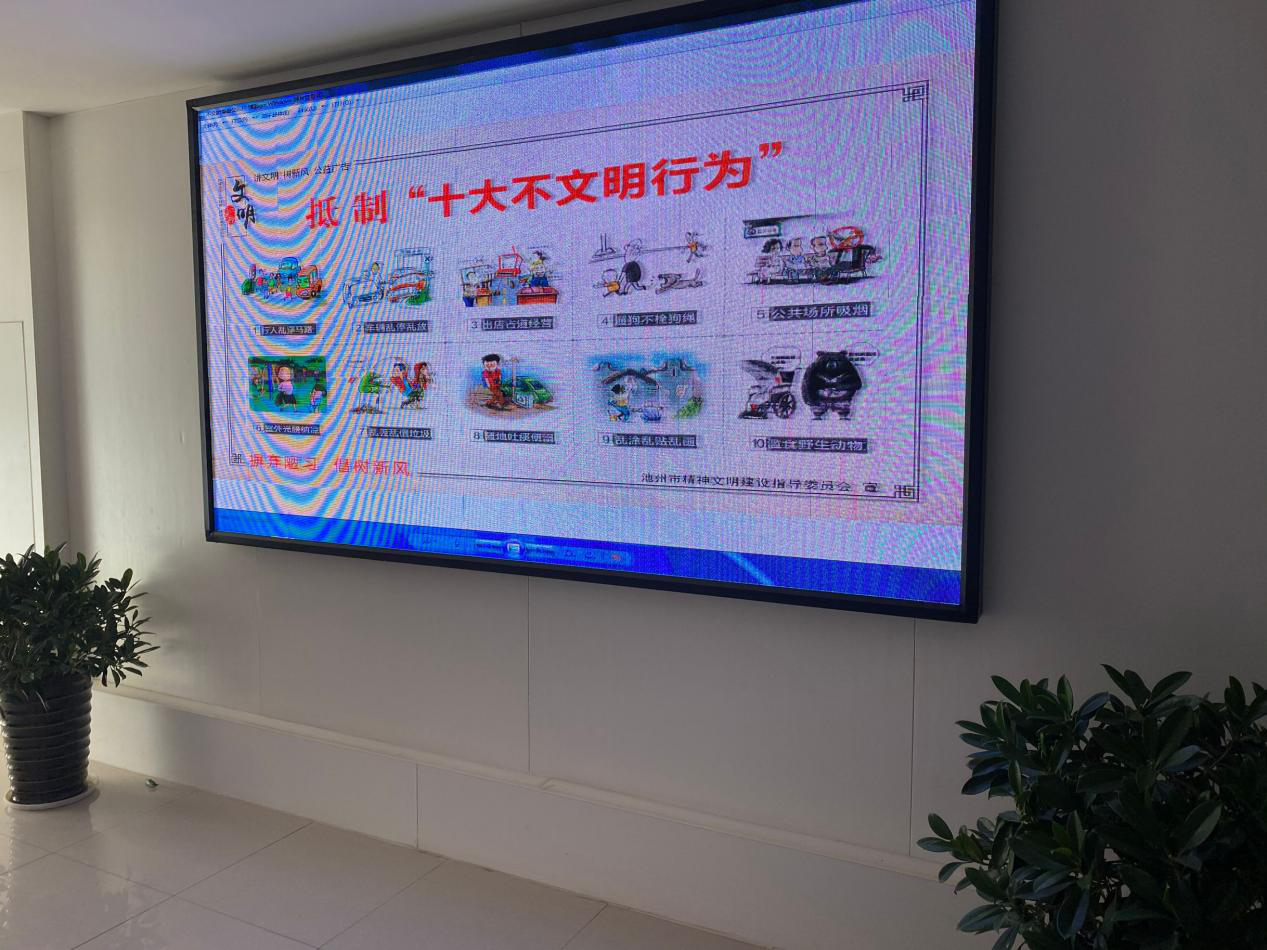 利用LED電子屏幕滾動(dòng)播放新修正的“十大不文明”行為類別;在公開(kāi)欄張貼宣傳圖;通過(guò)單位微信工作號(hào)推送摒棄“十大不文明”行為宣傳畫(huà)等方式。充分開(kāi)展宣傳活動(dòng),形成了全力抵制“十大不文明行為”、爭(zhēng)做文明人的濃厚氛圍。