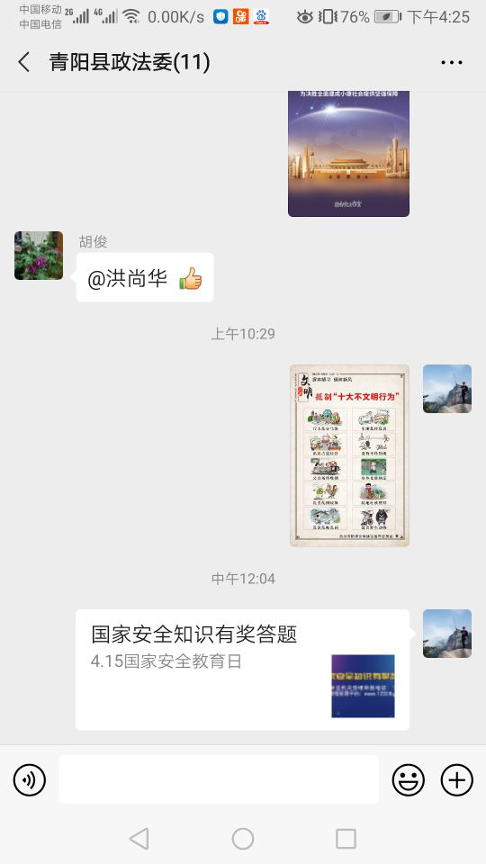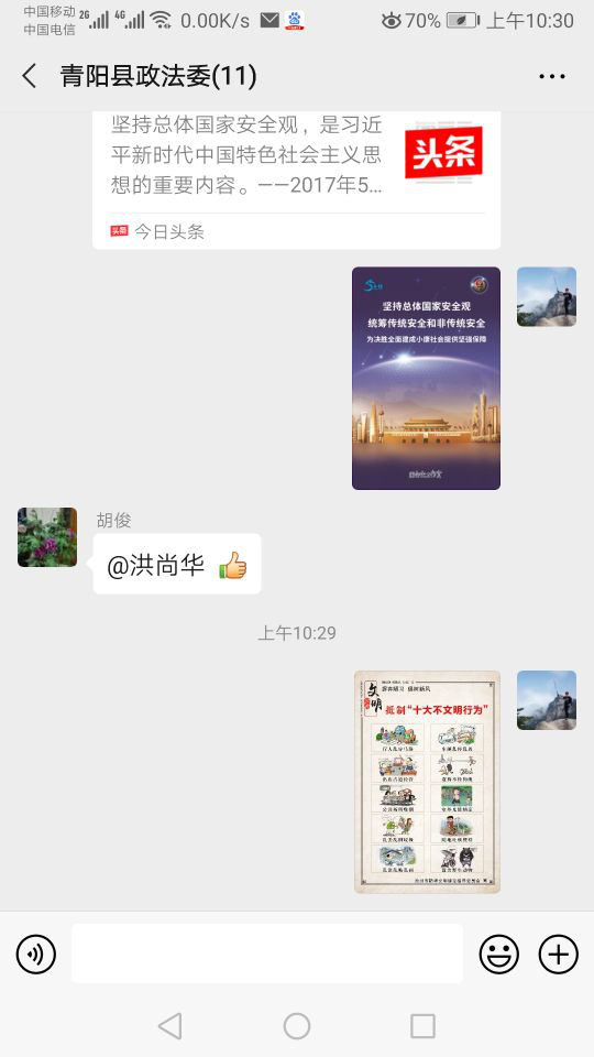 近日,青陽(yáng)縣委政法委根據(jù)縣文明辦要求,通過(guò)線上線下齊發(fā)力的方式,積極開(kāi)展摒棄“十大不文明”行為宣傳活動(dòng)。第一,利用單位電子屏幕,全天滾動(dòng)播放新修正的“十大不文明”行為類別。第二,通過(guò)單位微信工作群和微信公眾號(hào)推送摒棄“十大不文明”行為宣傳畫(huà),讓全體干部職工進(jìn)一步增強(qiáng)了文明意識(shí),為建設(shè)“修身福地、靈秀青陽(yáng)”及文明縣城創(chuàng)建工作做出了積極貢獻(xiàn)。