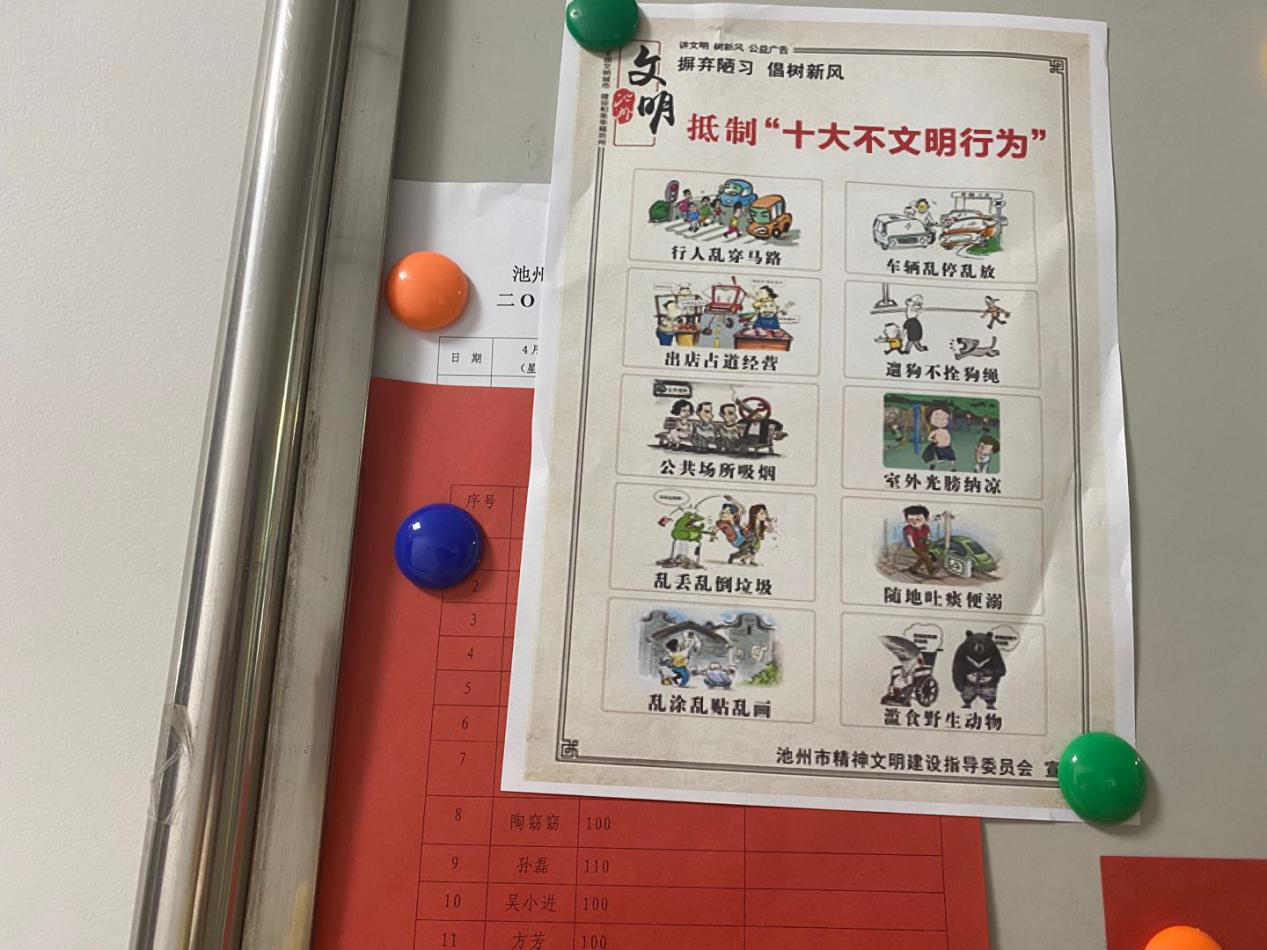 二是開(kāi)展宣傳進(jìn)聯(lián)系小區(qū)。在聯(lián)系小區(qū)政和苑小區(qū)主要出入口廣泛張貼展示“抵制‘十大不文明行為’”宣傳標(biāo)語(yǔ)和畫(huà)面的宣傳海報(bào),向小區(qū)內(nèi)居民群眾宣傳不文明行為,并通過(guò)輿論引導(dǎo)居民自覺(jué)抵制不文明行為,提升市民文明素質(zhì),創(chuàng)造良好的生活習(xí)慣,構(gòu)建文明的生活家園。