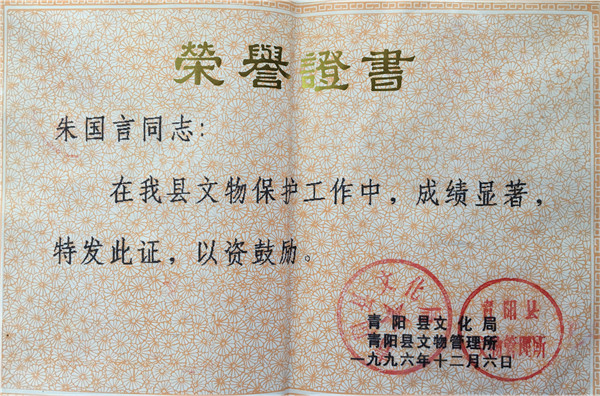 早就想采訪(fǎng)朱運(yùn)海,因?yàn)橐粍t新聞:1995年12月,青陽(yáng)縣廟前鎮(zhèn)十字村龍崗磚窯廠生產(chǎn)取土?xí)r,在朱家老墳地發(fā)現(xiàn)2座古墓, 發(fā)掘清理春秋晚期貴族墓一座,出土青銅禮器鼎,樂(lè)器鐸,兵器劍、戈、矛和一批陶器、漆木器等珍貴文物26件,村民朱國(guó)言等同志將文物無(wú)償捐獻(xiàn)給國(guó)家,青陽(yáng)縣文化局為朱國(guó)言頒發(fā)了榮譽(yù)證書(shū)。