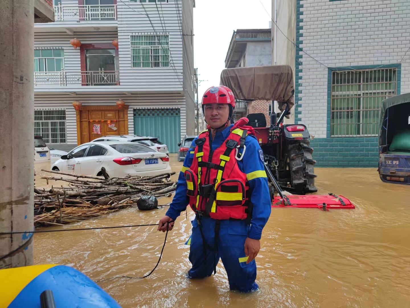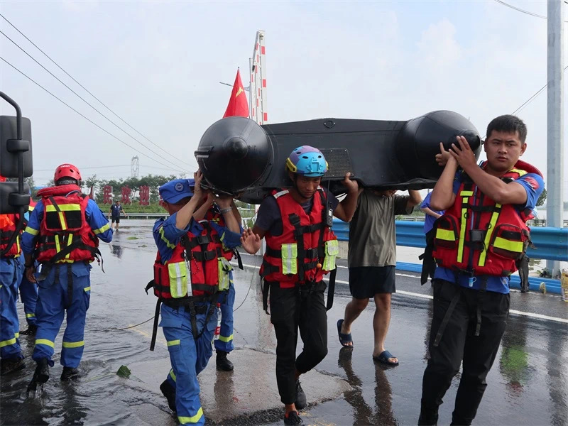 2022年6月21日江西發(fā)布紅色洪水預(yù)警!青陽(yáng)藍(lán)天應(yīng)急救援隊(duì)迅速集結(jié)奔赴災(zāi)區(qū)。此次江西洪水影響范圍為:南昌市、景德鎮(zhèn)市市轄區(qū)、樂(lè)平市、九江市、上饒市等地。20日晚七點(diǎn),救援隊(duì)施劍隊(duì)長(zhǎng)在組隊(duì)長(zhǎng)群里緊急布置任務(wù):“請(qǐng)各位組長(zhǎng)做好準(zhǔn)備,我們即將開赴景德鎮(zhèn)水災(zāi)前線執(zhí)行抗洪搶險(xiǎn)任務(wù)!”王金龍又一次積極響應(yīng),趕至隊(duì)部整裝待發(fā)。晚十一點(diǎn),施劍隊(duì)長(zhǎng)帶領(lǐng)13名救援隊(duì)水域精英,3輛車、2艘沖鋒舟、2臺(tái)發(fā)電機(jī)、一架無(wú)人機(jī),20件重心救生衣、14頂水域頭盔、應(yīng)急救援燈等水域救援裝備,緊急開拔江西景德鎮(zhèn)樂(lè)平市。藍(lán)天救援隊(duì)趕到現(xiàn)場(chǎng)后,利用橡皮艇挨家挨戶展開搜救。經(jīng)過(guò)15小時(shí)的緊張救援,藍(lán)天救援隊(duì)出艇十五余次,成功轉(zhuǎn)移受困群眾三十余人,運(yùn)輸物質(zhì)六余次,行船達(dá)數(shù)百公里。